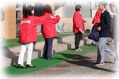 本校父母教師会健全育成委員会が中心となって年2回(春・秋)「登校時一声運動」を行っています。登校してきた生徒一人一人に,交通安全を呼びかけるメッセージの入ったポケットティッシュを手渡しながら,笑顔で声がけを行いました。