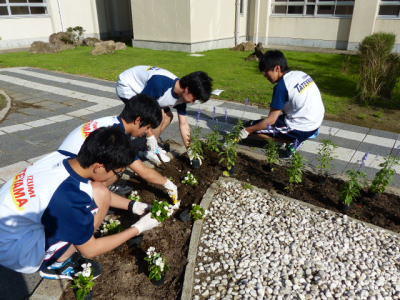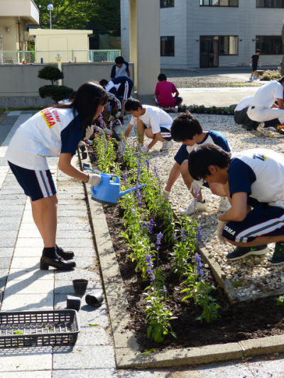 放課後,清掃美化委員が集まり,みんなで花の植付け作業をしました。初夏を迎え,新たな花たちが学校に新しい彩りを添えてくれることを祈り,みんなで一生懸命作業をしました。
