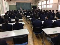 昼休みに入った直後,3学年主任が校内で受験勉強に励んでいた3年生に向けて,放送で激励会への集合を呼びかけると,会場の第二講義室へ3年生約90名が集まってきました。激励会では,3年生一人ひとりにお菓子が配られ,養護教諭から健康面のアドバイスと,3学年の各先生方から熱い激励の言葉が送られました。参加した3年生は,25日(火)の本番に向けてお互い励まし合いながら心を一つにし,試験に臨む決意を新たにしていました。3年生の健闘を祈ります。