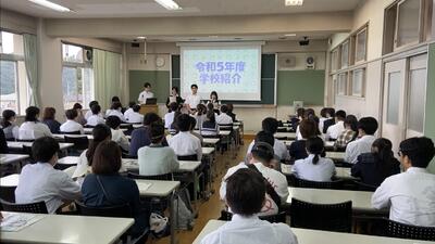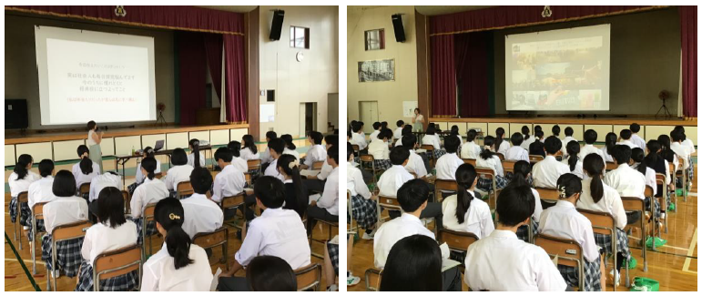 コモンタイムでは、校歌斉唱、校長講話に続き生徒体験発表を行いました。今回は全国総文祭(2023かごしま総文)に参加した放送部と囲碁将棋部から、全国大会の様子や感想、作品の紹介などがあり、全体で共有しました。
