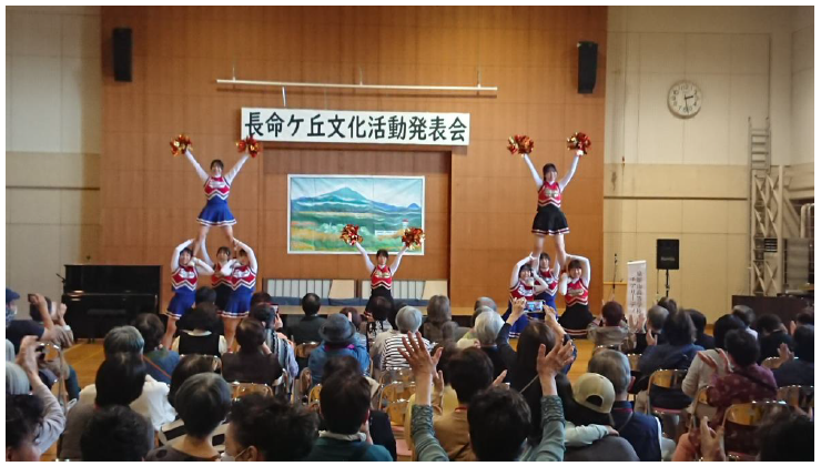 長命ケ丘市民センターで開催された「第25回長命ケ丘文化活動発表会」に、本校のチアリーダーが参加しました。日頃の練習の成果を発揮し、参加した方々から大きな拍手が送られました。