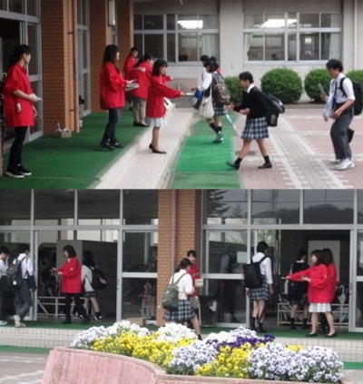 本校PTA健全育成委員会による「朝の一声運動」が行われました。「おはようございます。」と登校する生徒に声をかけながら,交通安全を意識してもらうチラシとポケットティッシュを配布しました。