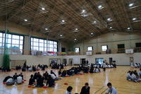 各班のテーマは多様で,「乳酸菌には食品以外にどのような活用方法があるか。」「視覚障がい者が社会参画するために既存のシステムに問題はあるか。」「南スーダンの貧困・飢餓を解決するために今後私たちができることは何か。」など様々です。この日は,これまで取り組んだ研究内容をワークシートにまとめ,体育館内で小グループに分かれて発表しました。発表後には,発表を聞いた他の班の人たちからたくさんの質問をもらい,後期の課題設定に生かします。後期はあらたにテーマを設定し,3月17日の発表会に向けて「課題探究」に取り組みます。