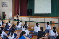 第1学年は,現在,日常生活の中の身近な課題からテーマを設定し,調査アクションを行っているところです。この日はクラスの中でその途中経過を共有する時間でした。「売店の利用者を増やすために。」「自分たちで自分たちの教室を快適に。」「館山タイムをよりよくする。」などの各班のテーマについて,ふせん紙をつかい他のグループからたくさんのコメントをもらいました。またグループごとにiPadや各自のスマホを使い,協働によって発表スライドを作成する作業も始まりました。