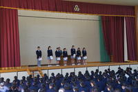 続いて始業式。校長講話では,「時間も空間も有限。捨てることと残したいものを選ぶこと。何が重要なのか見極めることが大切。特に3年生は,入試直前まで粘り,やってきたことを確認し,最後まで必死になって努力してほしい。」と生徒へ期待を述べられました。その後,先日の生徒会役員選挙で当選を果たした生徒会役員7名と応援団長の認証式が行われました。3年生からバトンを受け,1,2年生を中心とした生徒会が新たな船出となりました。