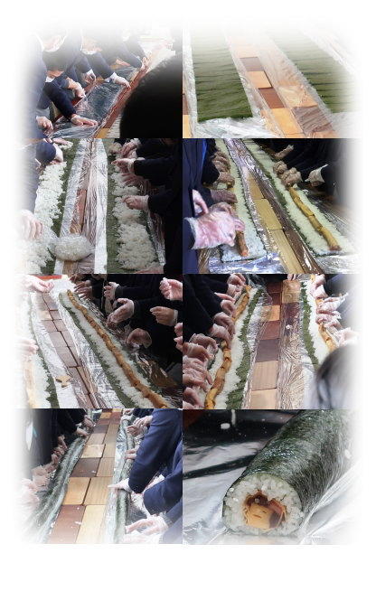 第2学年各クラスごとに廊下に机を並べ,クラス全員協力して1本の長さ約7mの恵方巻を作りました。各クラス2本作り,1人に約30cmずつ切り分けて南南東を向いて皆でおいしく食べました。