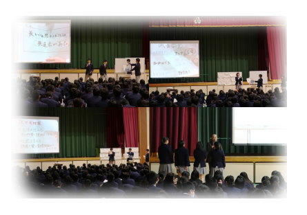 クラスの枠を超えたグループに分かれて取り組んできた自由課題研究について,先日行われた予選を経て選出された8グループが第1学年生徒全員の前で発表する全体発表会が行われました。審査の結果1グループに最優秀賞が学年主任より授与されました。