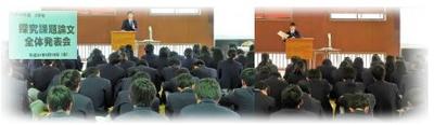 個人研究として各自がまとめた探究課題論文について,クラス内発表会を経て選出された各クラスの発表者が第2学年生徒全員の前で発表する全体発表会が行われました。
