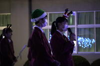 イルミネーションは、生徒会や有志実行委員によって例年この時期に行われている恒例行事。クリスマスシーズンの夕刻,様々な色の電飾に彩られた校舎が夜空に映え,校舎前一帯は幻想的な雰囲気に包まれます。今年は昇降口前だけでなく中庭にも電球を施しパワーアップしたイルミネーションとなっています。