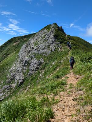 | <部紹介> 山岳部では月に1・2度、登山をしています。普段は、日帰りで近くの山に登ることが多いのですが、夏山合宿では2~3泊で遠方の山に出かけたり、冬の積雪期は里山歩き中心ですが、雪上歩行訓練やスキー教室なども計画しています。山頂の絶景や山で調理して食べる料理の美味しさなど、山岳部でしか体験できないことがたくさんあります。 |